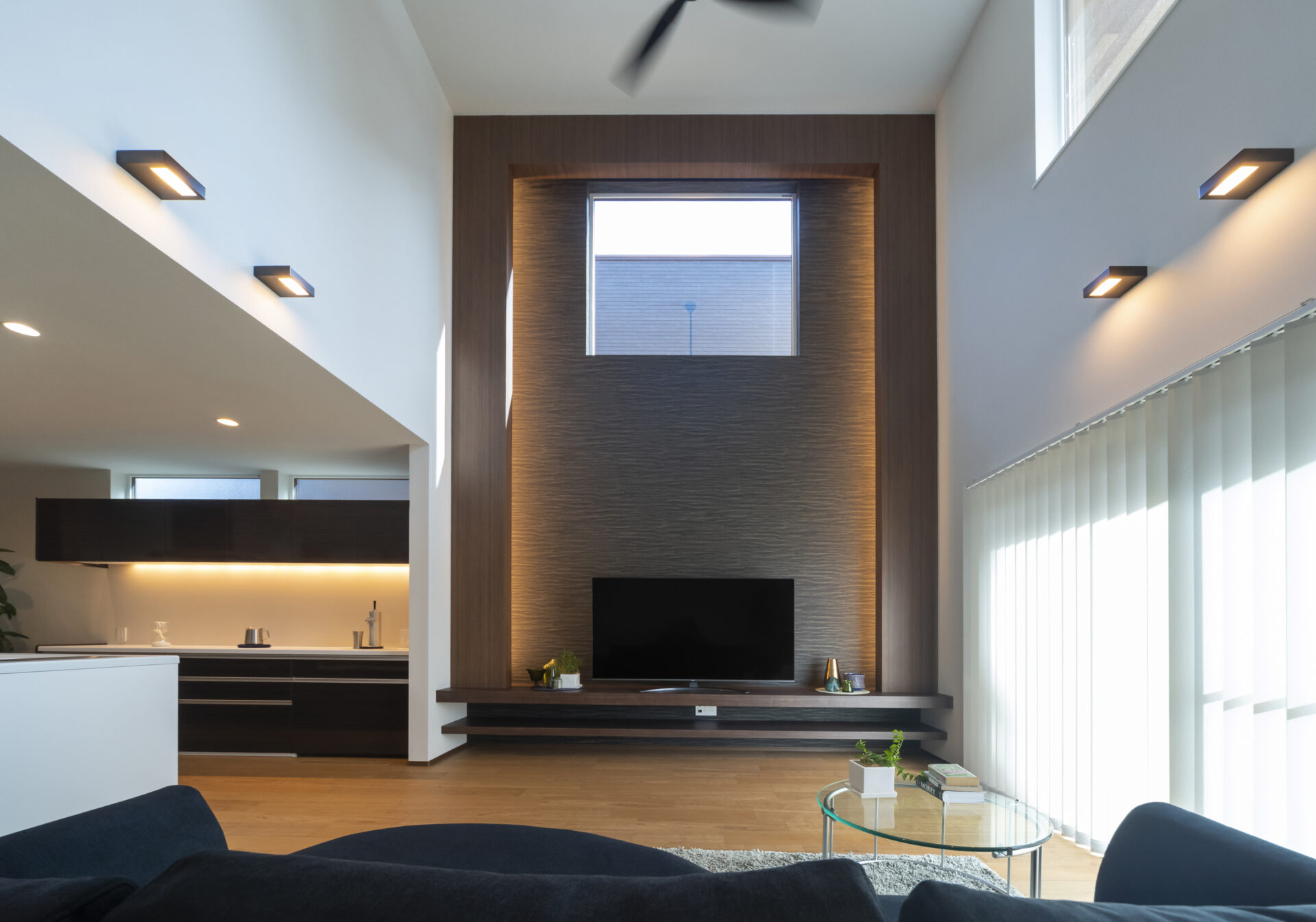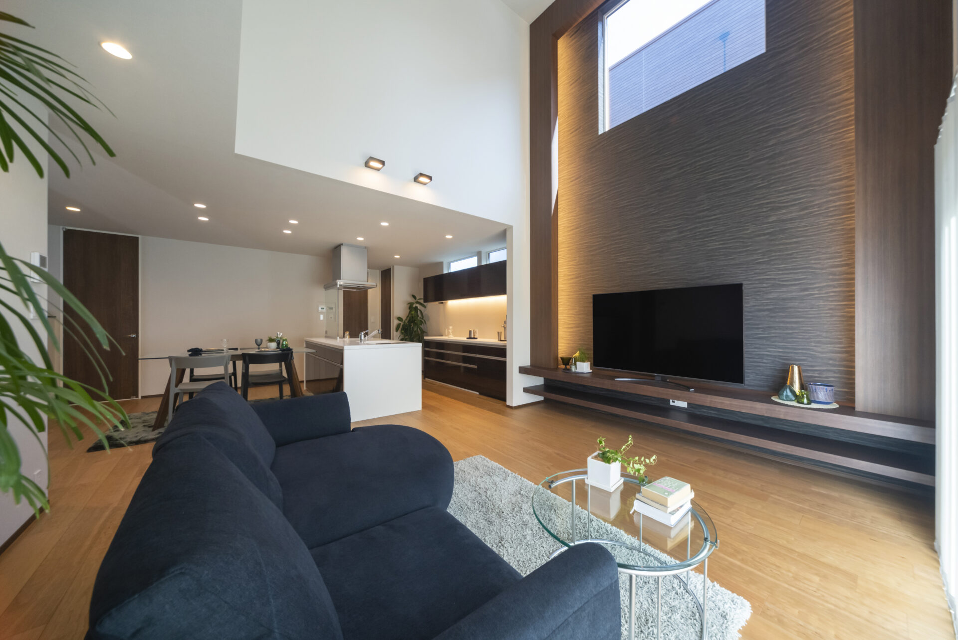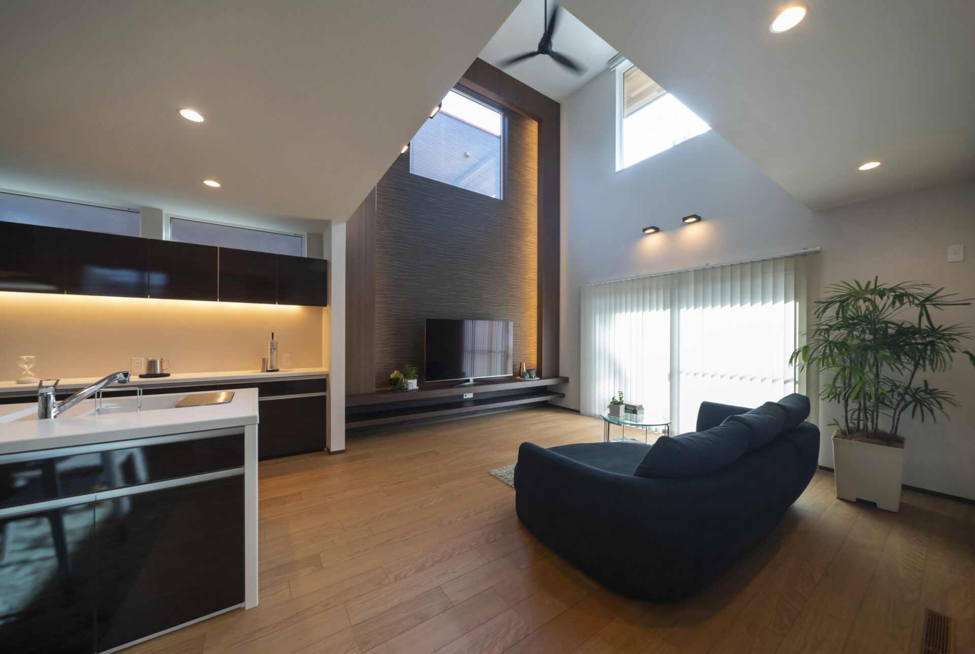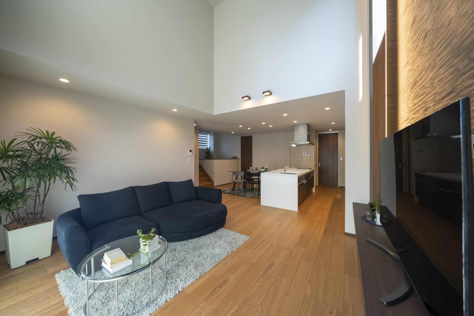 6帖の吹き抜けから光が降り注ぐ、明るく心地よいリビング。どこにいても自然の光を感じられる開放的な空間が、家族の時間をより豊かに彩ります。