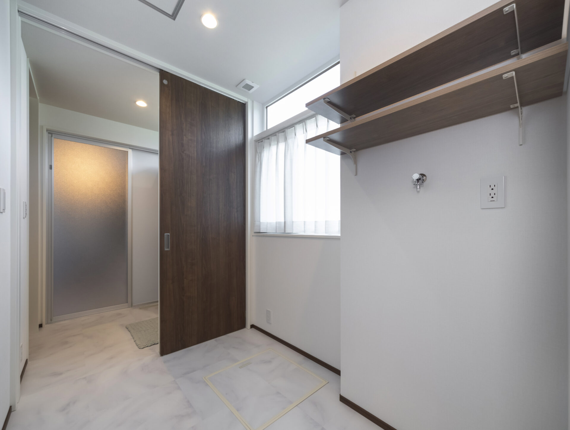 玄関、LDK、浴室、ランドリー、洗面をぐるっと回れる家事ラク動線。生活の流れがスムーズで、家事や身支度もストレスなくこなせる心地よい住まいです。