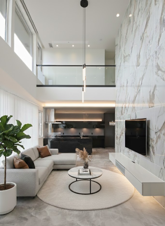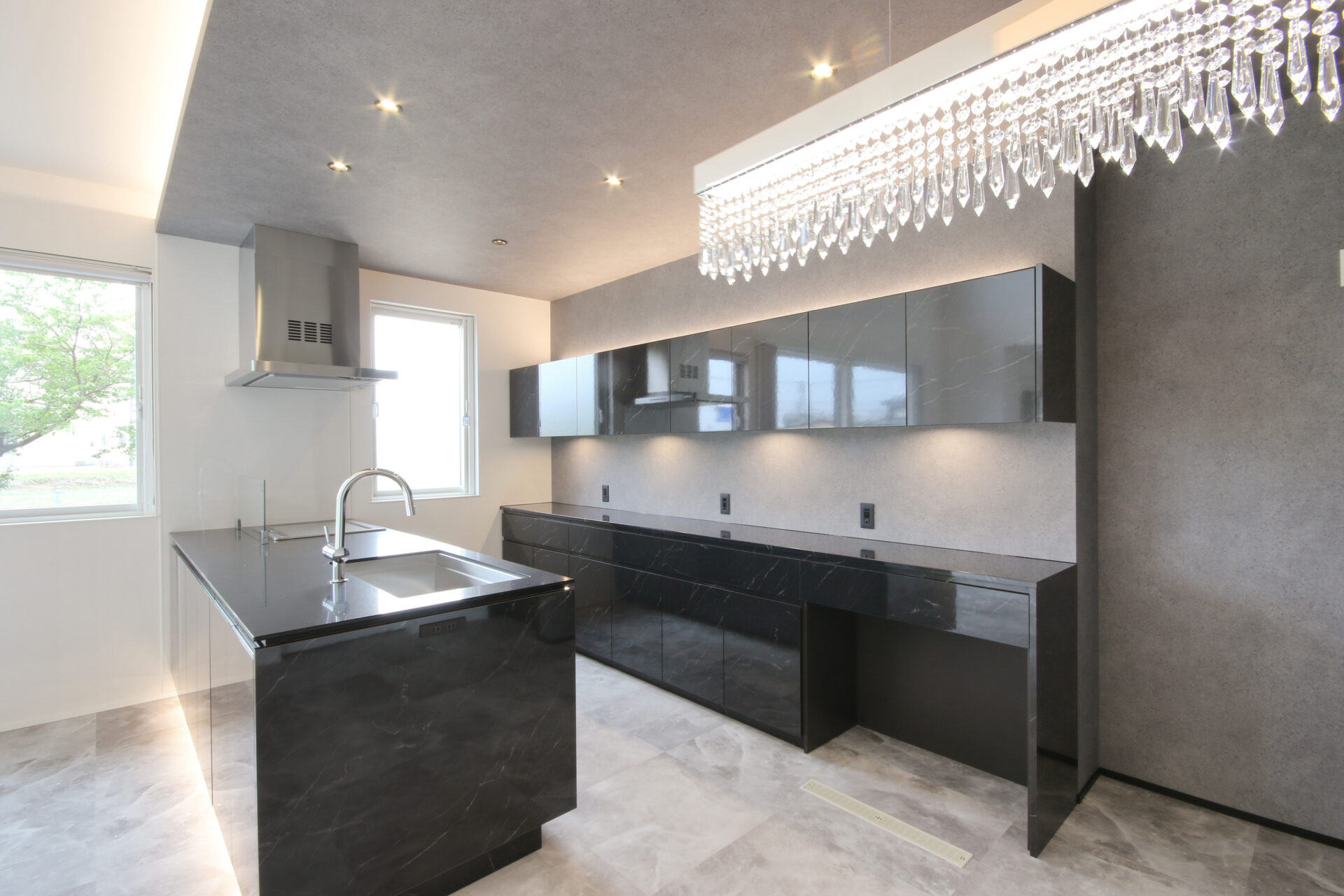 海外のラグジュアリーホテルのようなインテリア。デザイン性はもちろん、家事楽な間取り、室内と室外がつながる楽しい設計になっています。
