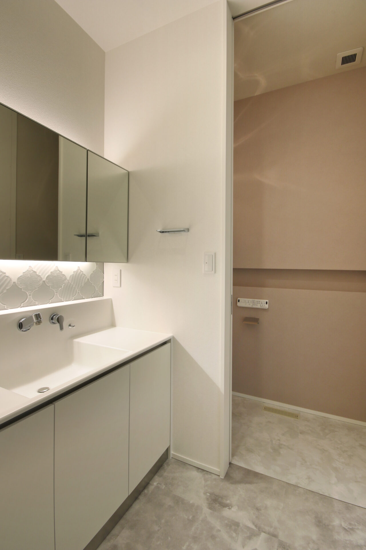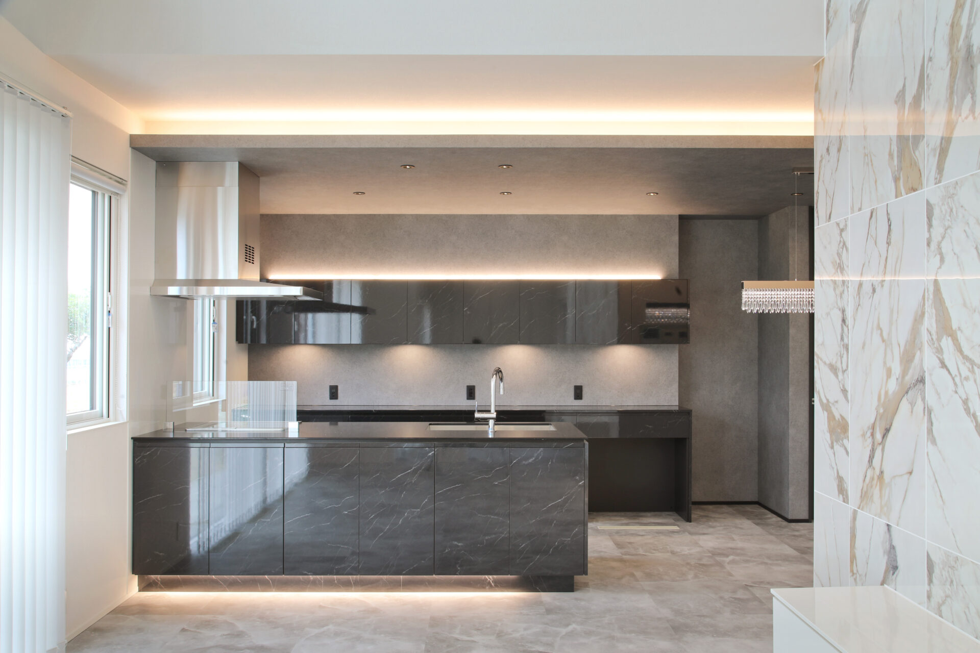海外のラグジュアリーホテルのようなインテリア。デザイン性はもちろん、家事楽な間取り、室内と室外がつながる楽しい設計になっています。