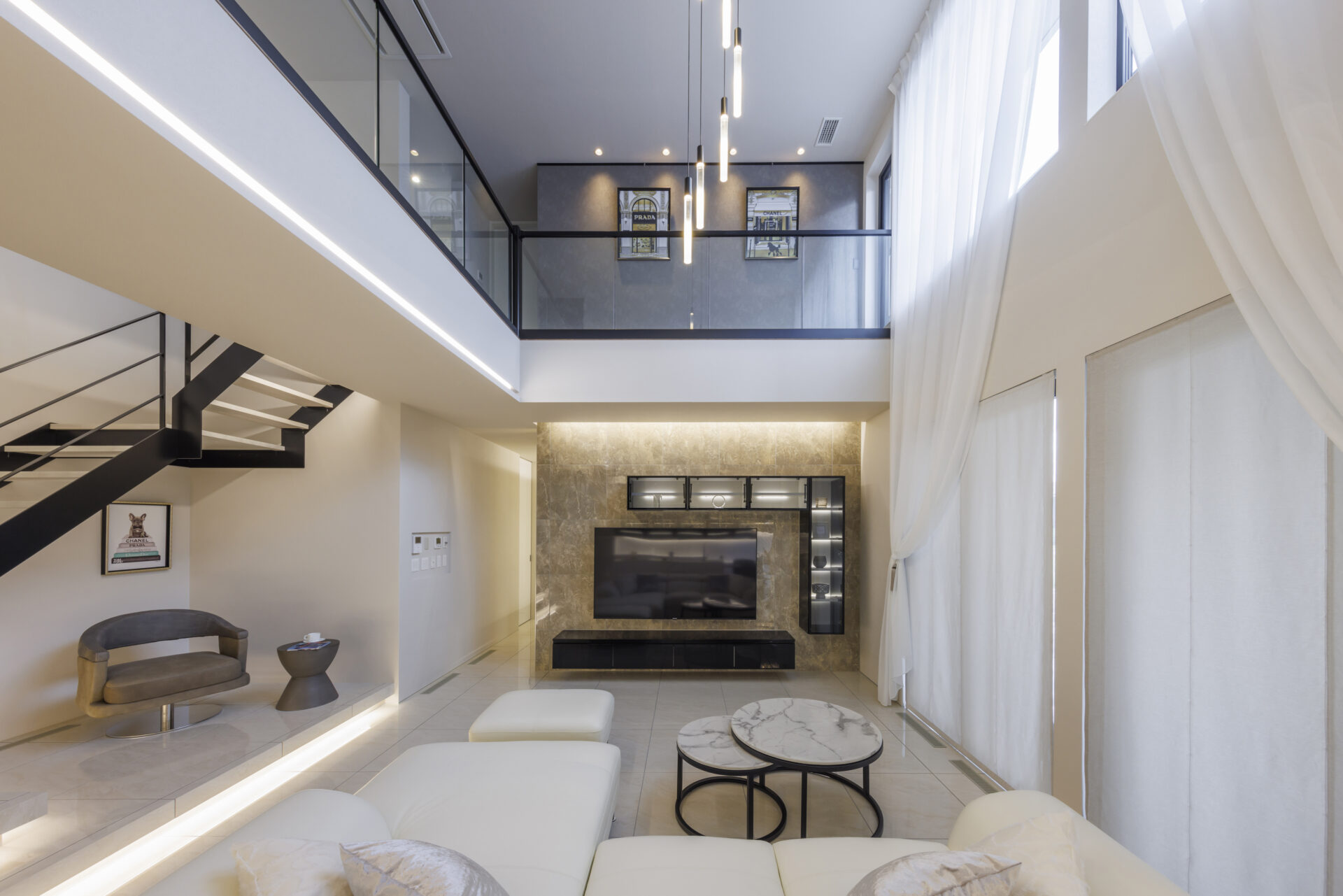 上質な素材と洗練されたデザインが調和する、ラグジュアリーな室内空間。吹き抜けの開放感と間接照明の柔らかな光が、心を満たす上質な時間を演出します。日常に特別感をもたらす、贅沢なくつろぎの住まいです。