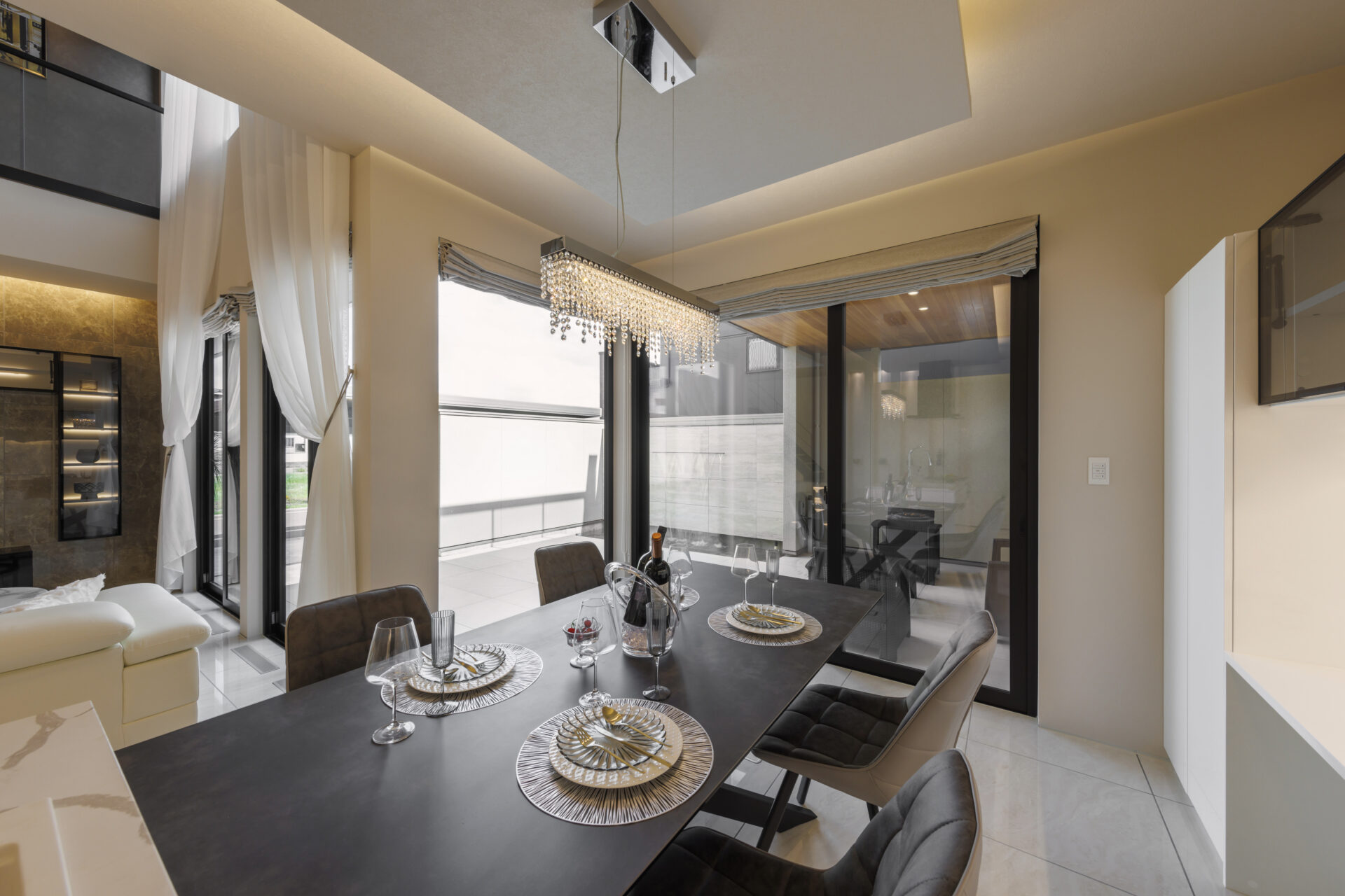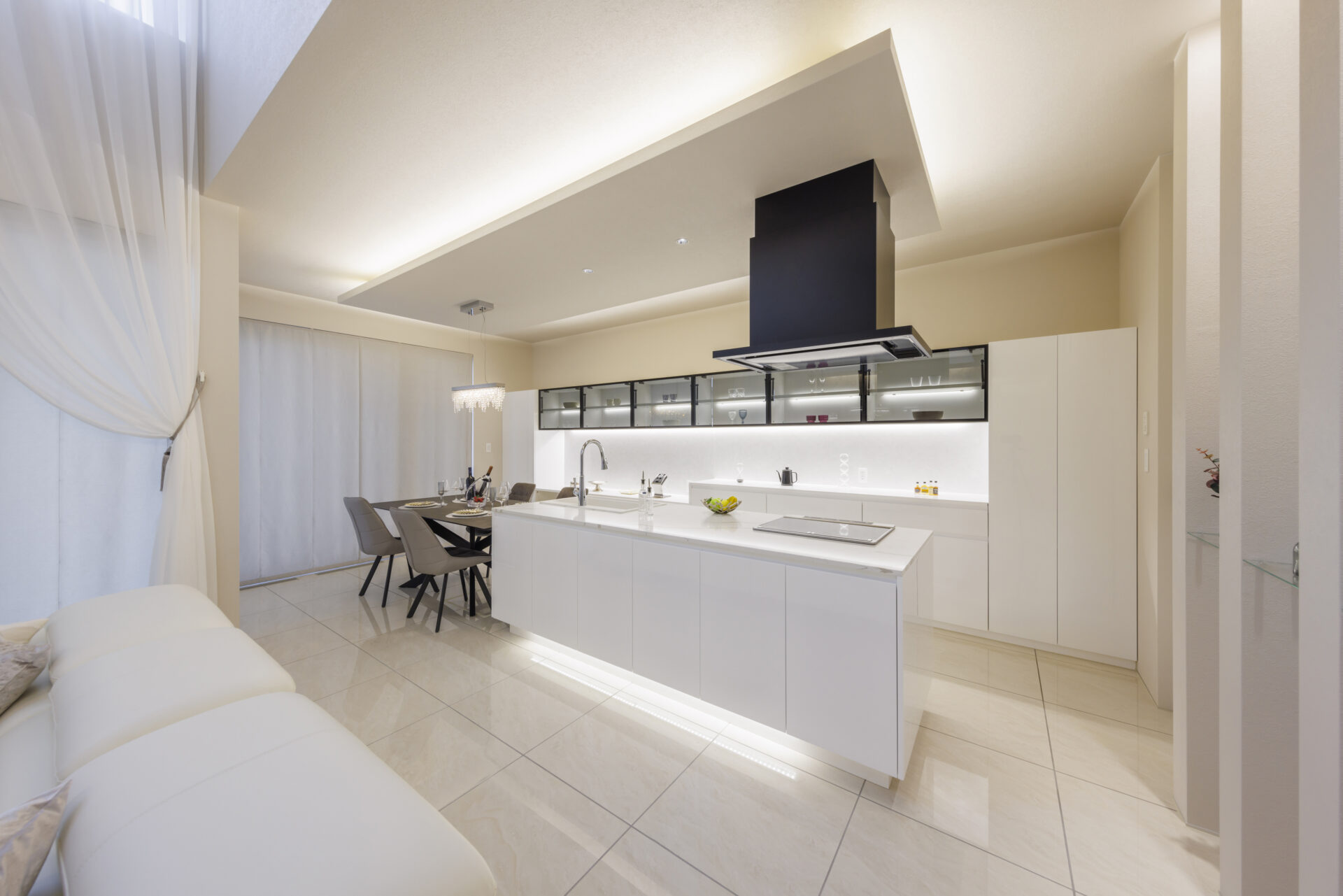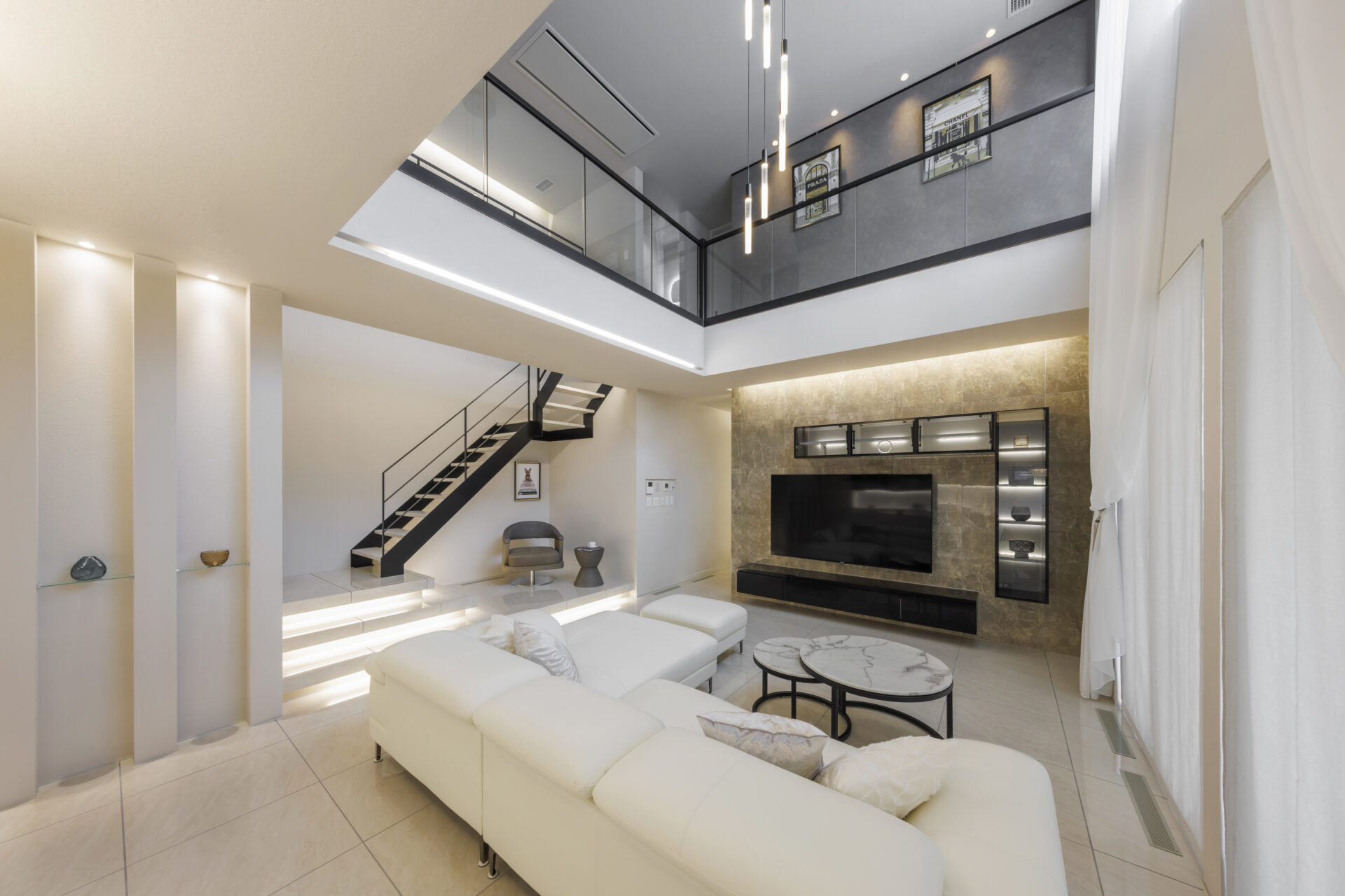上質な素材と洗練されたデザインが調和する、ラグジュアリーな室内空間。吹き抜けの開放感と間接照明の柔らかな光が、心を満たす上質な時間を演出します。日常に特別感をもたらす、贅沢なくつろぎの住まいです。
