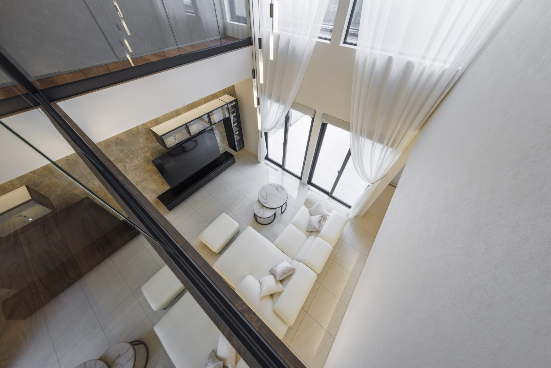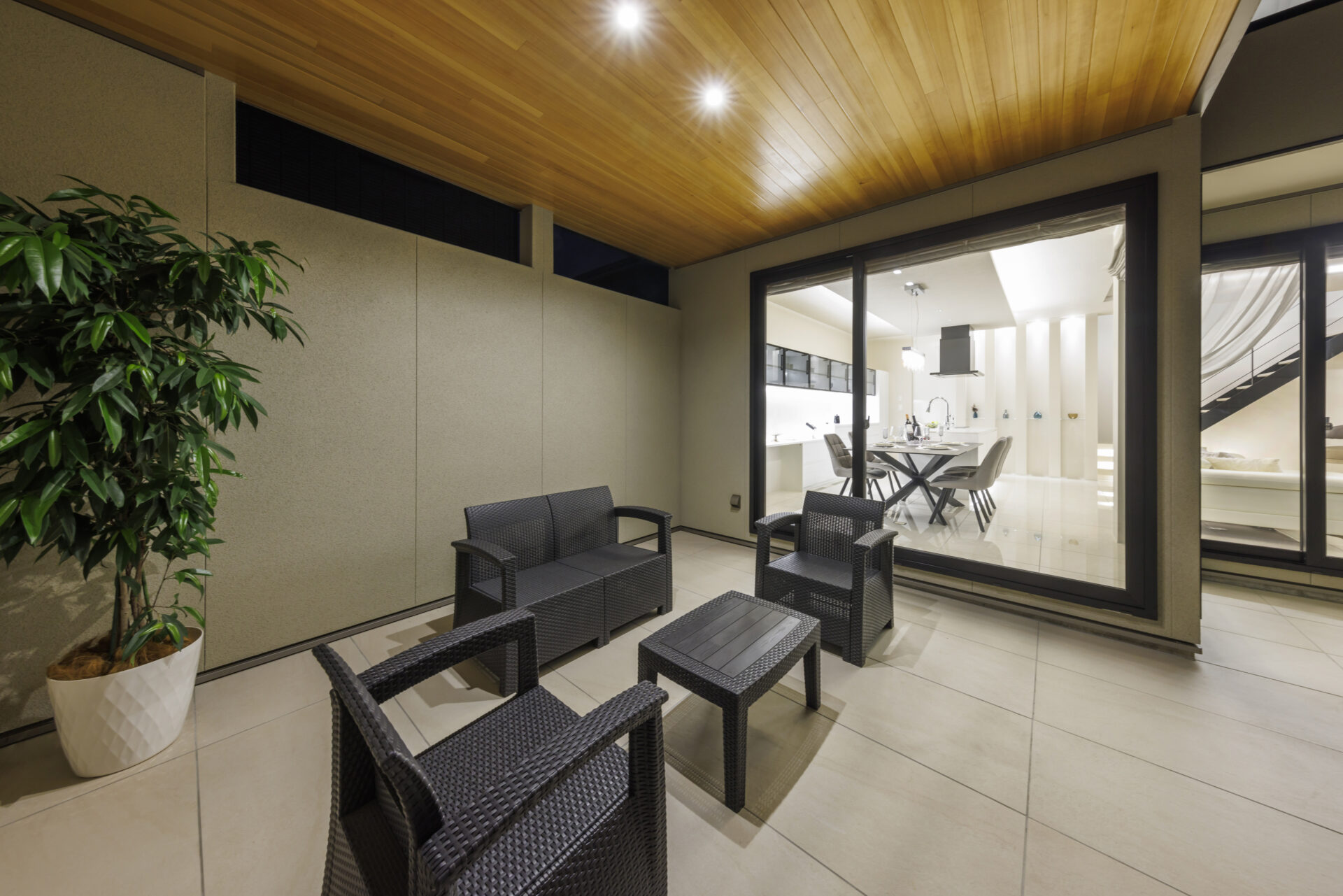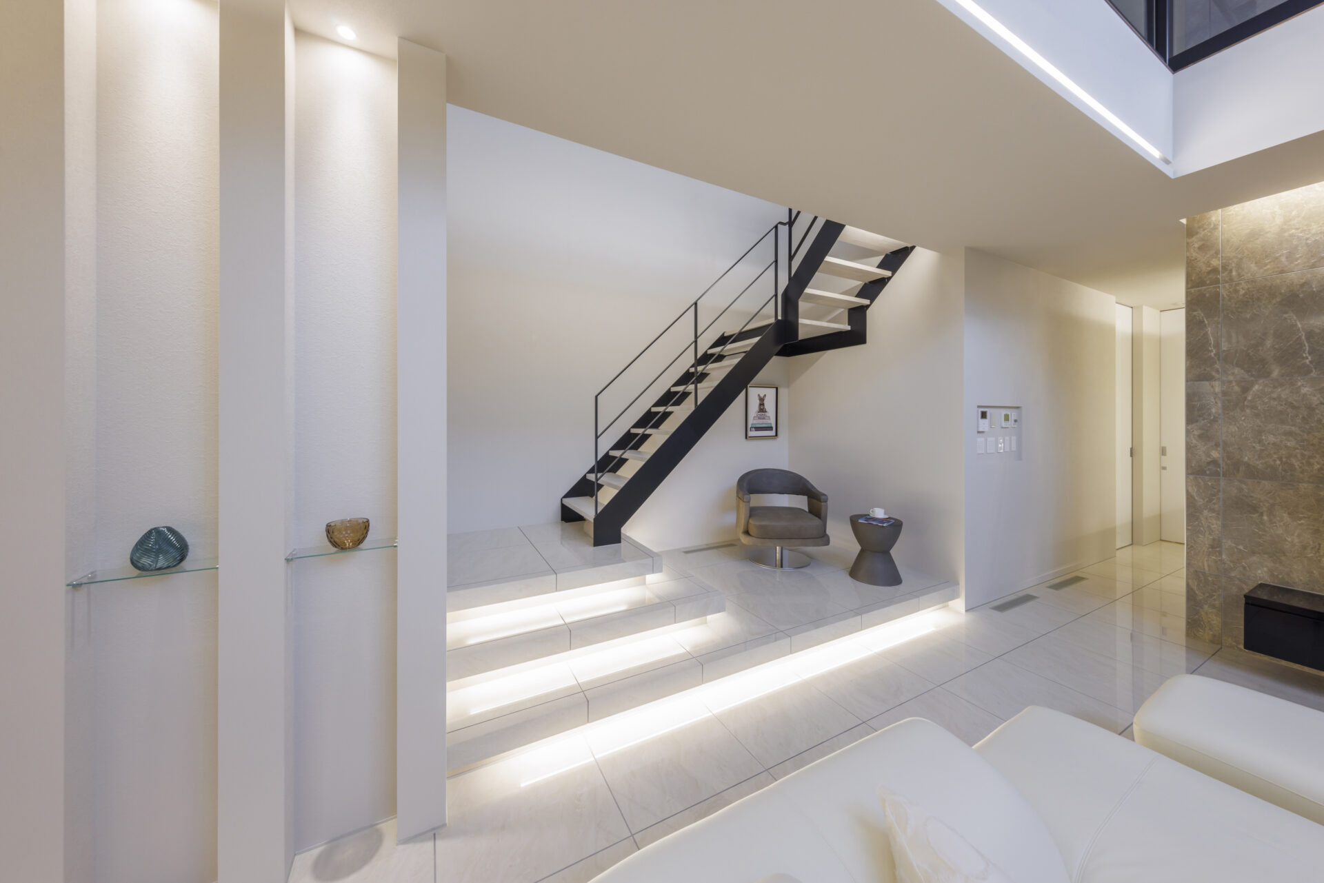 上質な素材と洗練されたデザインが調和する、ラグジュアリーな室内空間。吹き抜けの開放感と間接照明の柔らかな光が、心を満たす上質な時間を演出します。日常に特別感をもたらす、贅沢なくつろぎの住まいです。