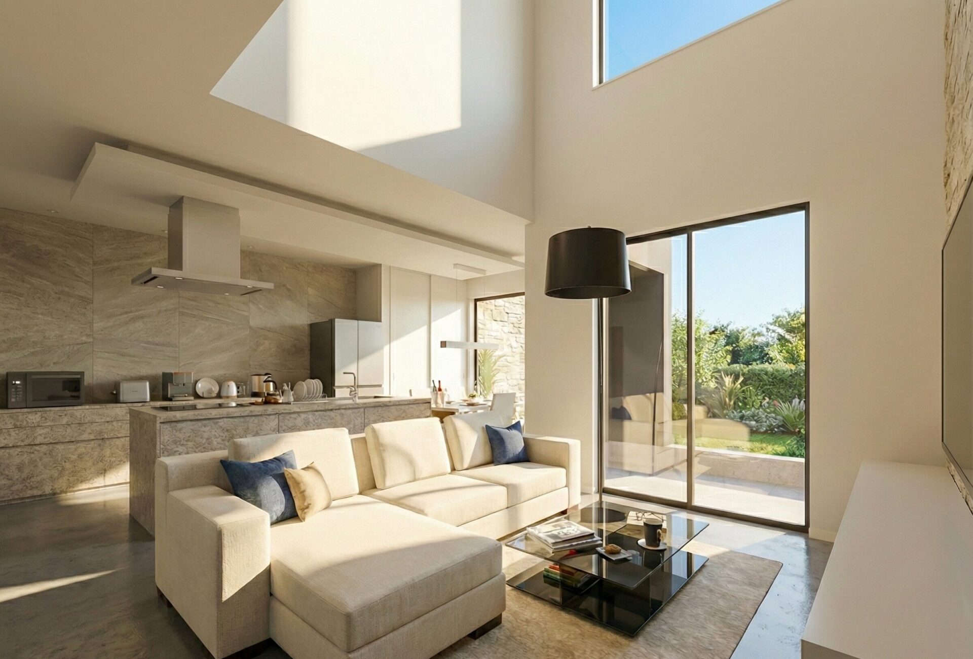 吹き抜けから降り注ぐ自然光が、LDK全体を明るく包み込みます。上下階につながる開放感と家族の気配を感じながら、心地よく過ごせるリビング空間です。