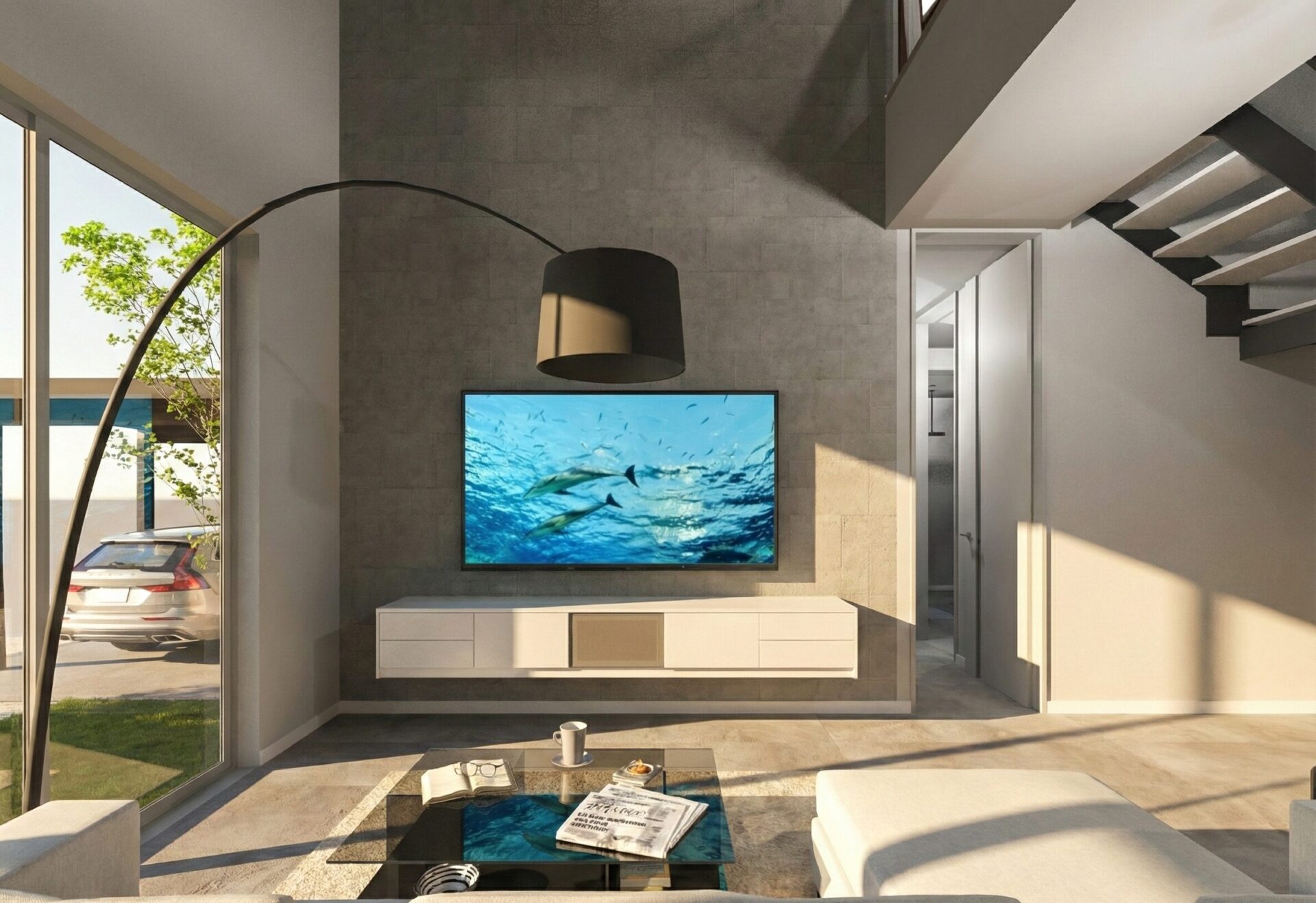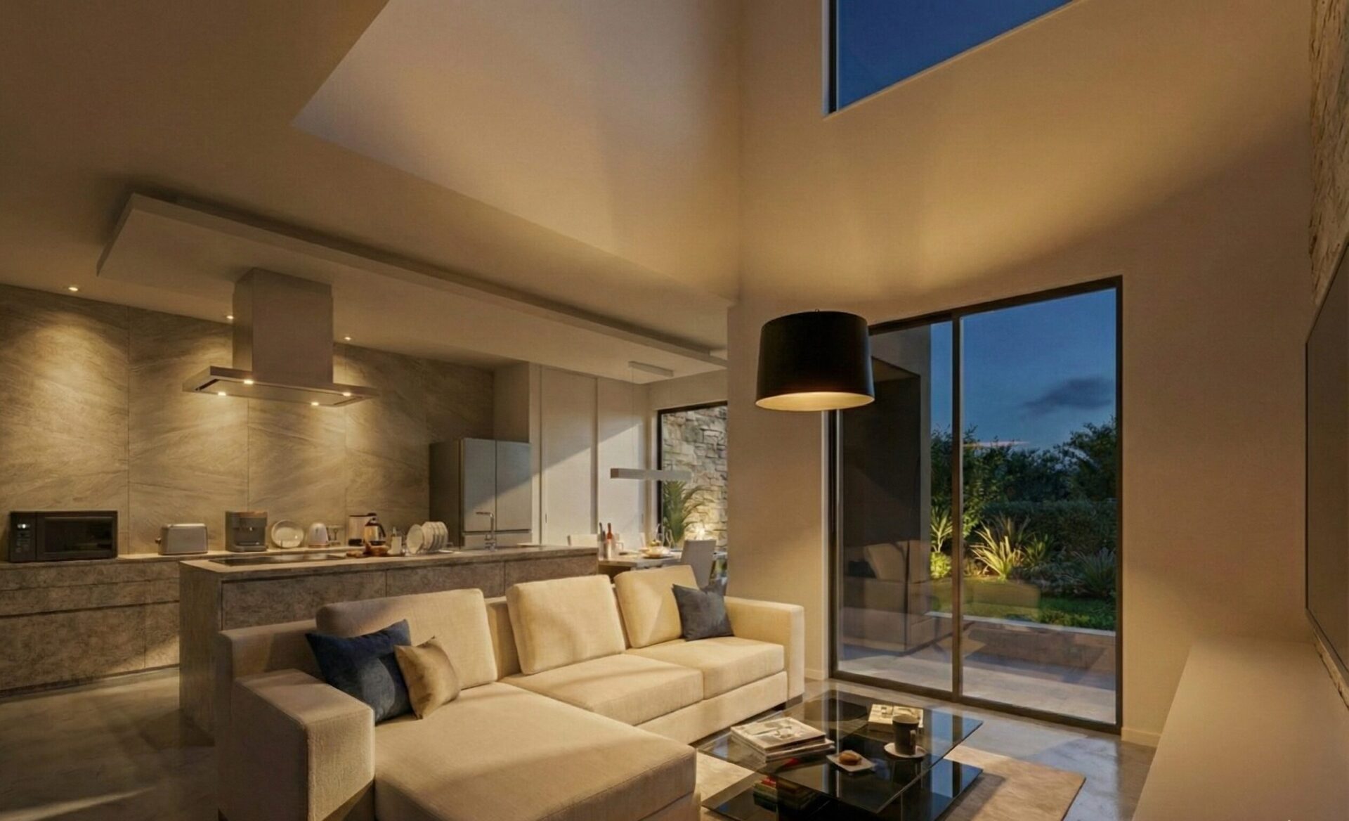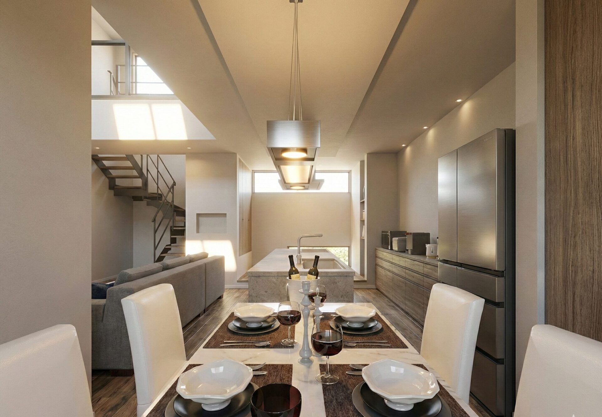 吹き抜けから降り注ぐ自然光が、LDK全体を明るく包み込みます。上下階につながる開放感と家族の気配を感じながら、心地よく過ごせるリビング空間です。