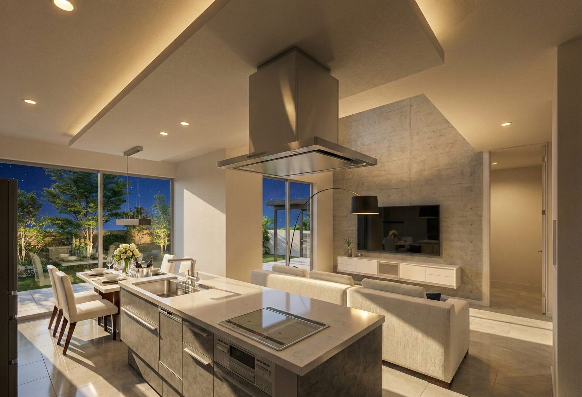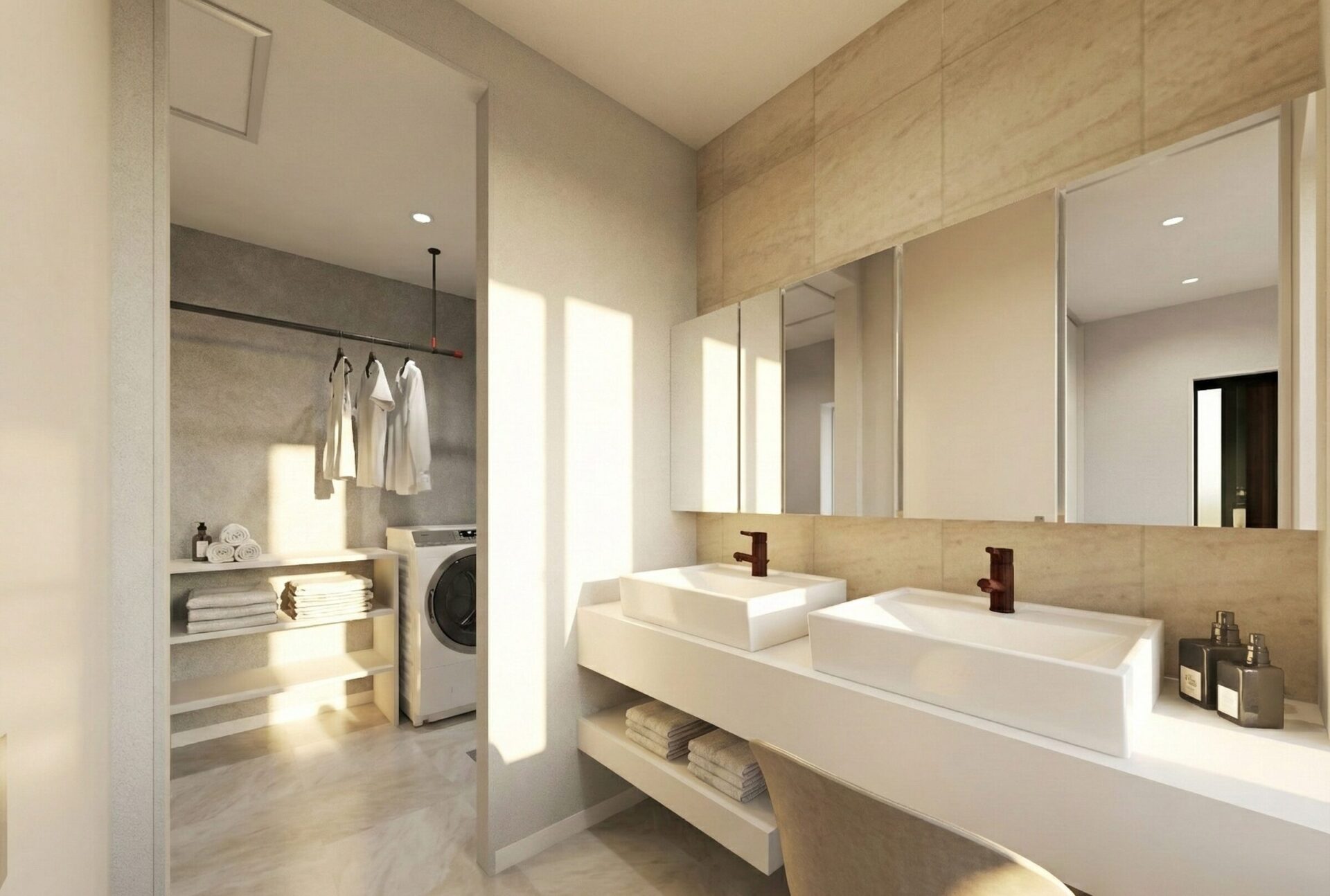 素材感や照明計画にこだわり、生活感を抑えた上質なホテルライク空間。毎日の暮らしの中で、まるでホテルに滞在しているかのような、落ち着きと非日常を感じられる住まいです。