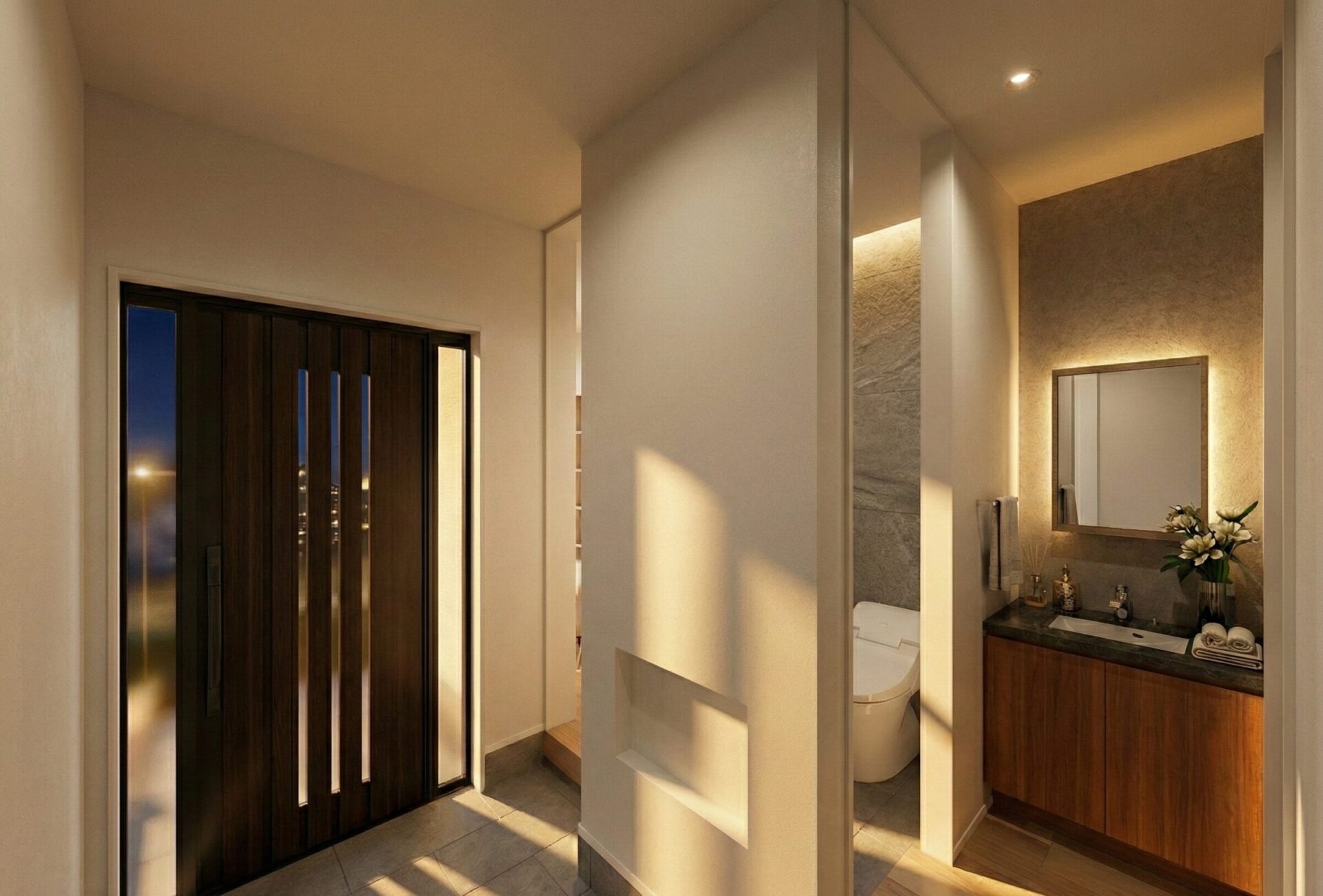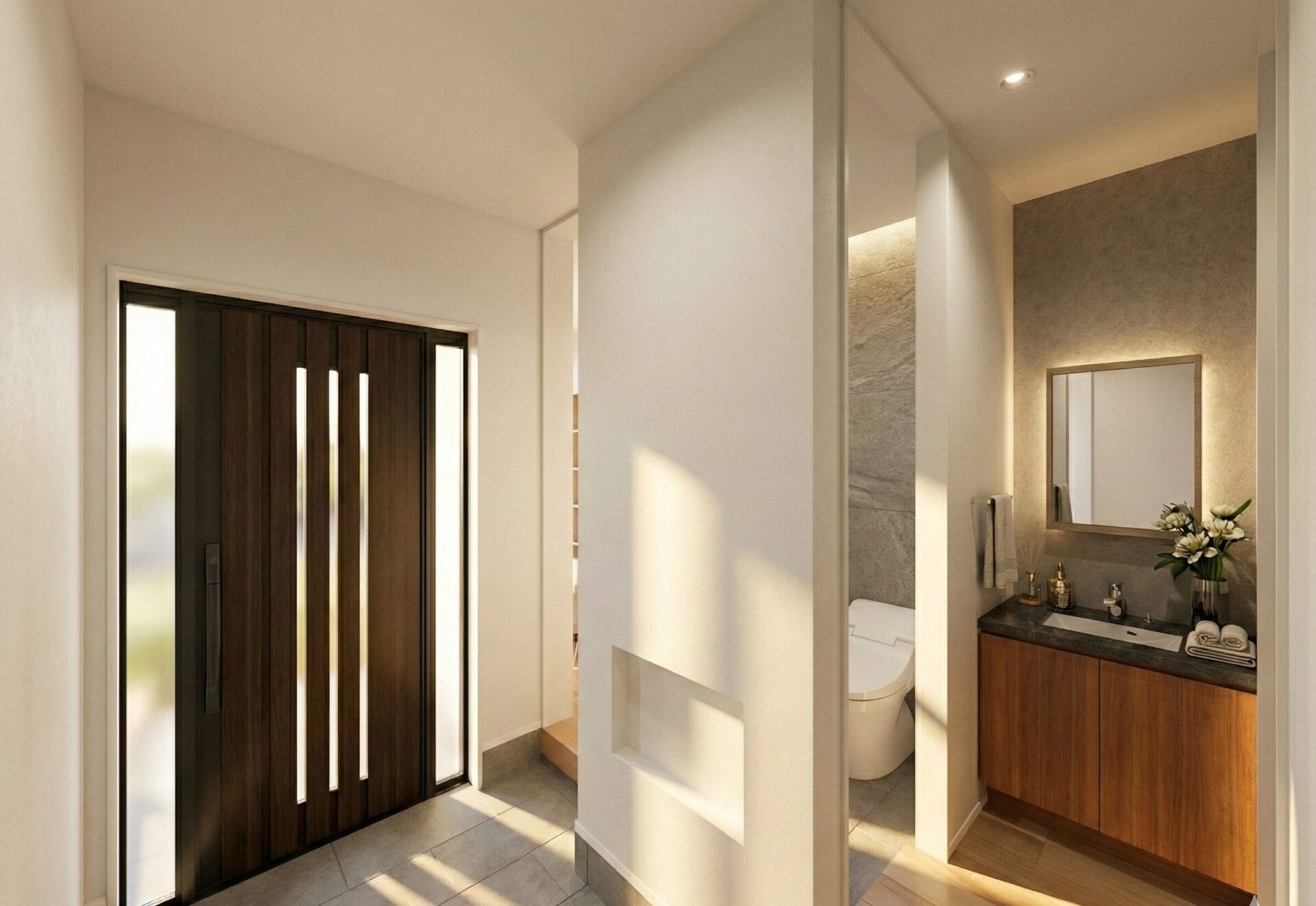 家全体を快適に保つ「オンレイ床暖システム」を採用。玄関から脱衣室まで、夏はさらりと涼しく冬は包み込むような暖かさ。メンテナンスも簡単で、心地よさが続きます。