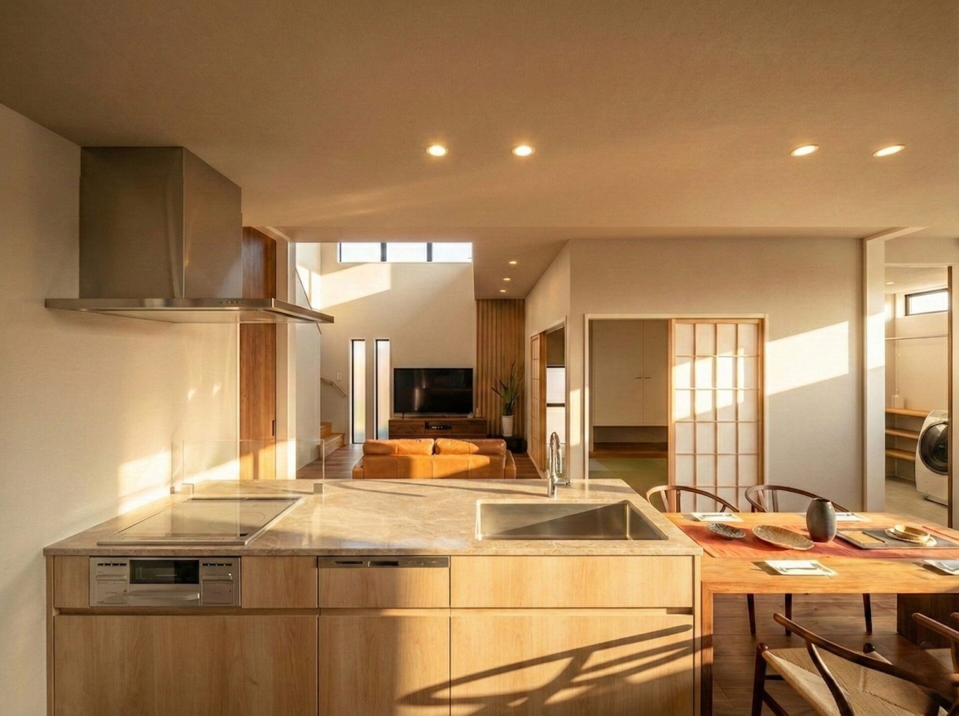 キッチン・リビングから目が届く使い勝手のよい和室、リビングを経由しながらも、くつろぎを妨げない水廻り動線